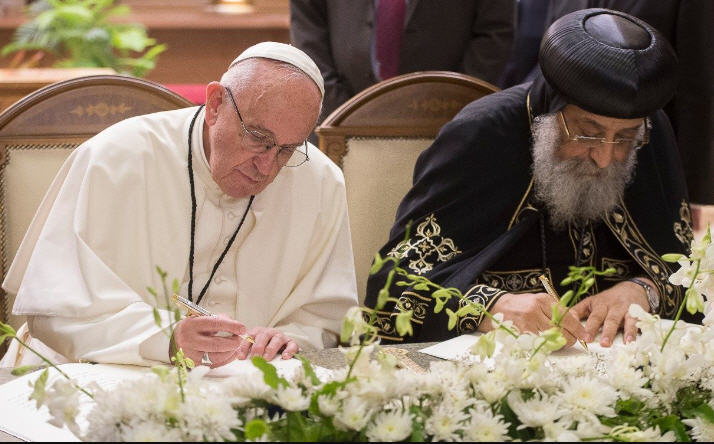 1. We, Francis, Bishop of Rome and Pope of the Catholic Church, and Tawadros II, Pope of Alexandria and Patriarch of the See of Saint Mark, give thanks to God in the Holy Spirit for granting us the joyful opportunity to meet once more, to exchange a fraternal embrace and to join again in common prayer. We glorify the Almighty for the bonds of fraternity and friendship existing between the See of Saint Peter and the See of Saint Mark. The privilege of being together here in Egypt is a sign that the solidity of our relationship is increasing year by year, and that we are growing in closeness, faith and love of Christ our Lord. We give thanks to God for this beloved Egypt, the “homeland that lives inside us,” as His Holiness Pope Shenouda III used to say, the “people blessed by God” (cf. Is 19:25) with its ancient Pharaonic civilization, the Greek and Roman heritage, the Coptic tradition and the Islamic presence. Egypt is the place where the Holy Family found refuge, a land of martyrs and saints.