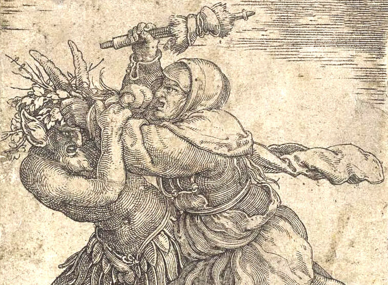 A Witch Attacks the Devil, woodcut, Binck, 1528 |