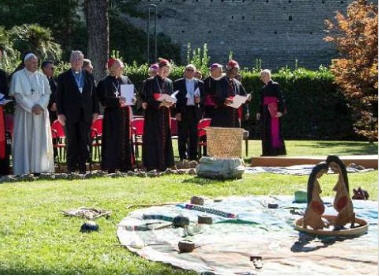 A group of people, including Amazonians in ritual dress, as well people in lay clothes and a Franciscan brother, knelt and bowed in a circle around images of two pregnant women who appeared to be semi-clothed, in the presence of the pope and members of the curia.