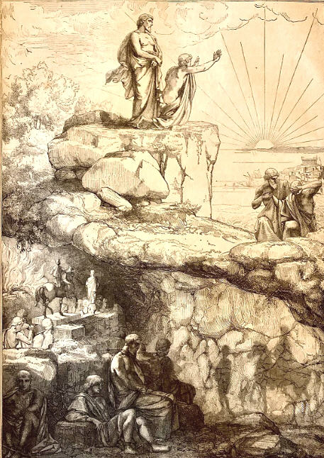 AND now, I said, let me show in a figure how far our nature is enlightened or unenlightened: --Behold! human beings living in a underground cave, which has a mouth open towards the light and reaching all along the den; here they have been from their childhood, and have their legs and necks chained so that they cannot move, and can only see before them, being prevented by the chains from turning round their heads. |