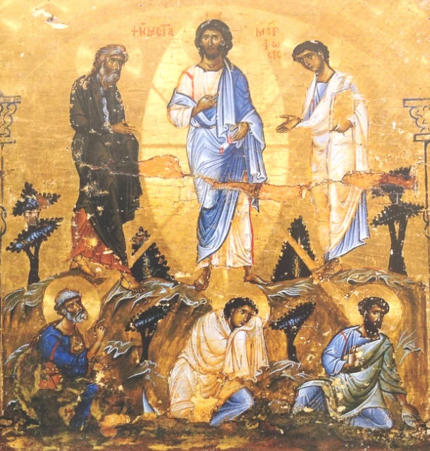 Λαβὼν τοίνυν τοὺς κορυφαίους͵ Ἀναφέρει εἰς ὄρος ὑψηλὸν κατ΄ ἰδίαν͵ καὶ μετεμορφώθη ἔμπροσθεν αὐ τῶν͵ καὶ ἔλαμψε τὸ πρόσωπον αὐτοῦ ὡς ὁ ἥλιος͵ τὰ δὲ ἱμάτια αὐτοῦ γέγονε λευκὰ ὡς τὸ φῶς. |