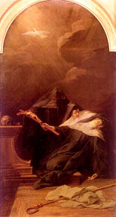 [Gregory:] THE next day the venerable woman went back to her cell, and the man of God returned to the monastery. Three days later, standing in his cell, he lifted his eyes to the sky and saw his sister’s soul leave her body and, in the form of a dove, penetrate the secret recesses of heaven. Overjoyed at her great glory, he gave thanks to Almighty God in hymns and elegies of praise, and announced her death to the brethren. |