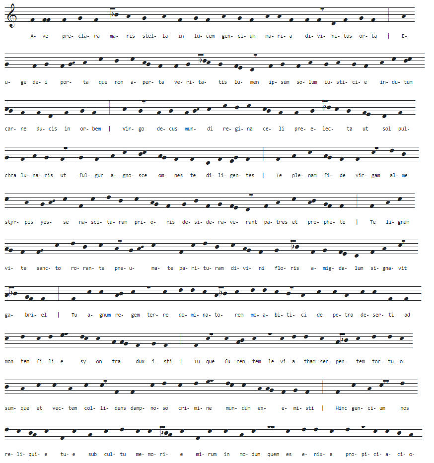 1. Ave, præclara maris stella, in lucem gentium, Maria, divinitus orta. |