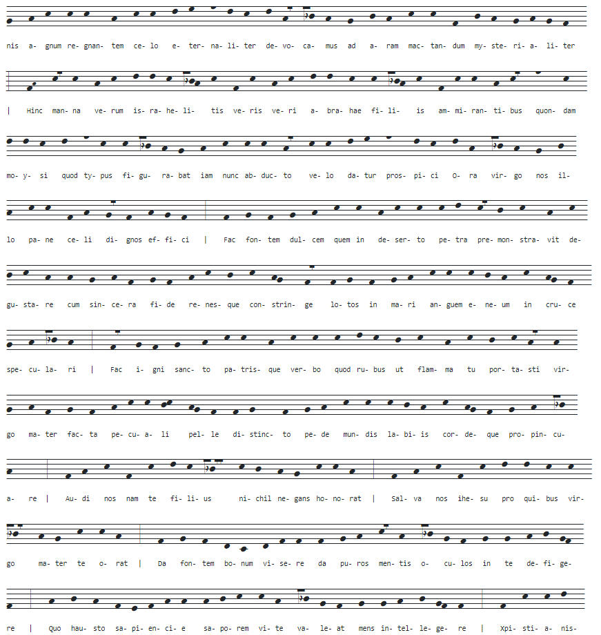 jam nunc abducto velo datur perspici. Ora, virgo, nos illo pane coeli dignos effici. |