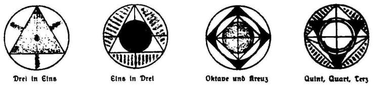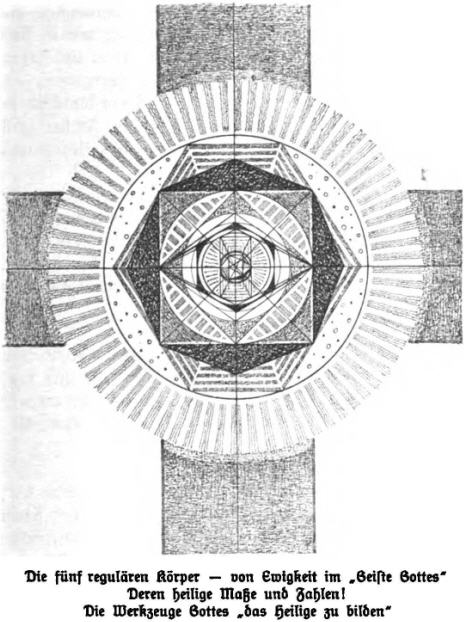 Furthemore, these are also the five regular bodies, which carry in themselves all the dimensions to serve the sacred aesthetic geometry. Their names, in the order in which they fit into the sphere, are: [p.369] First in the cavity between the cube and its sphere is the pentagonal dodecahedron; because standing outside the cube, called: the first, the outer golden section body: it encloses the cube, which is the king of all five, their head and the bearer of all, which in its square surface carries the root of 1 as a side and the root of 2 as a diagonal.[6]