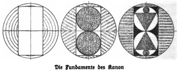 [1] Here the author reasons as a pure artist. Before him he has above all (or perhaps exclusively) the figure of the human body, or rather the ideal of the human structure, the canon, composed of a circle, a square and a triangle. For Lenz, these are the original figures and symbols of God, one and triune, which he, basing himself on the words of Genesis, finds reflected in the normative proportions of man. Surely, without number and measure, image and form, thinking the human being in the image and likeness of God in soul and body is impossible. But just as certainly, God, the immeasurable, has no number, no measure, no shape or image; although all these concepts, like all others, reside in Him and spring from Him.