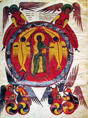 Ezekiel 1:1-28 καὶ ἐγένετο ἐν τῷ τριακοστῷ ἔτει ἐν τῷ τετάρτῳ μηνὶ πέμπτῃ τοῦ μηνὸς καὶ ἐγὼ ἤμην ἐν μέσῳ τῆς αἰχμαλωσίας ἐπὶ τοῦ ποταμοῦ τοῦ Χοβαρ καὶ ἠνοίχθησαν οἱ οὐρανοί καὶ εἶδον ὁράσεις θεοῦ 2 πέμπτῃ τοῦ μηνός τοῦτο τὸ ἔτος τὸ πέμπτον τῆς αἰχμαλωσίας τοῦ βασιλέως Ιωακιμ 3 καὶ ἐγένετο λόγος κυρίου πρὸς Ιεζεκιηλ υἱὸν Βουζι τὸν ἱερέα ἐν γῇ Χαλδαίων ἐπὶ τοῦ ποταμοῦ τοῦ Χοβαρ καὶ ἐγένετο ἐπ᾽ἐμὲ χεὶρ κυρίου 4 καὶ εἶδον καὶ ἰδοὺ πνεῦμα ἐξαῖρον ἤρχετο ἀπὸ βορρᾶ καὶ νεφέλη μεγάλη ἐν αὐτῷ καὶ φέγγος κύκλῳ αὐτοῦ καὶ πῦρ ἐξαστράπτον καὶ ἐν τῷ μέσῳ αὐτοῦ ὡς ὅρασις ἠλέκτρου ἐν μέσῳ τοῦ πυρὸς καὶ φέγγος ἐν αὐτῷ 5 καὶ ἐν τῷ μέσῳ ὡς ὁμοίωμα τεσσάρων ζῴων καὶ αὕτη ἡ ὅρασις αὐτῶν ὁμοίωμα ἀνθρώπου ἐπ᾽αὐτοῖς 6 καὶ τέσσαρα πρόσωπα τῷ ἑνί καὶ τέσσαρες πτέρυγες τῷ ἑνί 7 καὶ τὰ σκέλη αὐτῶν ὀρθά καὶ πτερωτοὶ οἱ πόδες αὐτῶν καὶ σπινθῆρες ὡς ἐξαστράπτων χαλκός καὶ ἐλαφραὶ αἱ πτέρυγες αὐτῶν 8 καὶ χεὶρ ἀνθρώπου ὑποκάτωθεν τῶν πτερύγων αὐτῶν ἐπὶ τὰ τέσσαρα μέρη αὐτῶν καὶ τὰ πρόσωπα αὐτῶν τῶν τεσσάρων 9 οὐκ ἐπεστρέφοντο ἐν τῷ βαδίζειν αὐτά ἕκαστον κατέναντι τοῦ προσώπου αὐτῶν ἐπορεύοντο 10 καὶ ὁμοίωσις τῶν προσώπων αὐτῶν πρόσωπον ἀνθρώπου καὶ πρόσωπον λέοντος ἐκ δεξιῶν τοῖς τέσσαρσιν καὶ πρόσωπον μόσχου ἐξ ἀριστερῶν τοῖς τέσσαρσιν καὶ πρόσωπον ἀετοῦ τοῖς τέσσαρσιν 11 καὶ αἱ πτέρυγες αὐτῶν ἐκτεταμέναι ἄνωθεν τοῖς τέσσαρσιν ἑκατέρῳ δύο συνεζευγμέναι πρὸς ἀλλήλας καὶ δύο ἐπεκάλυπτον ἐπάνω τοῦ σώματος αὐτῶν 12 καὶ ἑκάτερον κατὰ πρόσωπον αὐτοῦ ἐπορεύετο οὗ ἂν ἦν τὸ πνεῦμα πορευόμενον ἐπορεύοντο καὶ οὐκ ἐπέστρεφον 13 καὶ ἐν μέσῳ τῶν ζῴων ὅρασις ὡς ἀνθράκων πυρὸς καιομένων ὡς ὄψις λαμπάδων συστρεφομένων ἀνὰ μέσον τῶν ζῴων καὶ φέγγος τοῦ πυρός καὶ ἐκ τοῦ πυρὸς ἐξεπορεύετο ἀστραπή 14 15 καὶ εἶδον καὶ ἰδοὺ τροχὸς εἷς ἐπὶ τῆς γῆς ἐχόμενος τῶν ζῴων τοῖς τέσσαρσιν 16 καὶ τὸ εἶδος τῶν τροχῶν ὡς εἶδος θαρσις καὶ ὁμοίωμα ἓν τοῖς τέσσαρσιν καὶ τὸ ἔργον αὐτῶν ἦν καθὼς ἂν εἴη τροχὸς ἐν τροχῷ 17 ἐπὶ τὰ τέσσαρα μέρη αὐτῶν ἐπορεύοντο οὐκ ἐπέστρεφον ἐν τῷ πορεύεσθαι αὐτὰ 18 οὐδ᾽οἱ νῶτοι αὐτῶν καὶ ὕψος ἦν αὐτοῖς καὶ εἶδον αὐτά καὶ οἱ νῶτοι αὐτῶν πλήρεις ὀφθαλμῶν κυκλόθεν τοῖς τέσσαρσιν 19 καὶ ἐν τῷ πορεύεσθαι τὰ ζῷα ἐπορεύοντο οἱ τροχοὶ ἐχόμενοι αὐτῶν καὶ ἐν τῷ ἐξαίρειν τὰ ζῷα ἀπὸ τῆς γῆς ἐξῄροντο οἱ τροχοί 20 οὗ ἂν ἦν ἡ νεφέλη ἐκεῖ τὸ πνεῦμα τοῦ πορεύεσθαι ἐπορεύοντο τὰ ζῷα καὶ οἱ τροχοὶ καὶ ἐξῄροντο σὺν αὐτοῖς διότι πνεῦμα ζωῆς ἦν ἐν τοῖς τροχοῖς 21 ἐν τῷ πορεύεσθαι αὐτὰ ἐπορεύοντο καὶ ἐν τῷ ἑστάναι αὐτὰ εἱστήκεισαν καὶ ἐν τῷ ἐξαίρειν αὐτὰ ἀπὸ τῆς γῆς ἐξῄροντο σὺν αὐτοῖς ὅτι πνεῦμα ζωῆς ἦν ἐν τοῖς τροχοῖς 22 καὶ ὁμοίωμα ὑπὲρ κεφαλῆς αὐτοῖς τῶν ζῴων ὡσεὶ στερέωμα ὡς ὅρασις κρυστάλλου ἐκτεταμένον ἐπὶ τῶν πτερύγων αὐτῶν ἐπάνωθεν 23 καὶ ὑποκάτω τοῦ στερεώματος αἱ πτέρυγες αὐτῶν ἐκτεταμέναι πτερυσσόμεναι ἑτέρα τῇ ἑτέρᾳ ἑκάστῳ δύο συνεζευγμέναι ἐπικαλύπτουσαι τὰ σώματα αὐτῶν 24 καὶ ἤκουον τὴν φωνὴν τῶν πτερύγων αὐτῶν ἐν τῷ πορεύεσθαι αὐτὰ ὡς φωνὴν ὕδατος πολλοῦ καὶ ἐν τῷ ἑστάναι αὐτὰ κατέπαυον αἱ πτέρυγες αὐτῶν 25 καὶ ἰδοὺ φωνὴ ὑπεράνωθεν τοῦ στερεώματος τοῦ ὄντος ὑπὲρ κεφαλῆς αὐτῶν 26 ὡς ὅρασις λίθου σαπφείρου ὁμοίωμα θρόνου ἐπ᾽αὐτοῦ καὶ ἐπὶ το