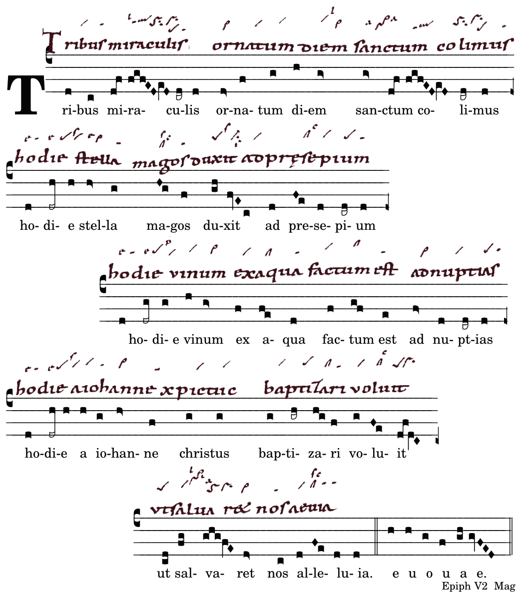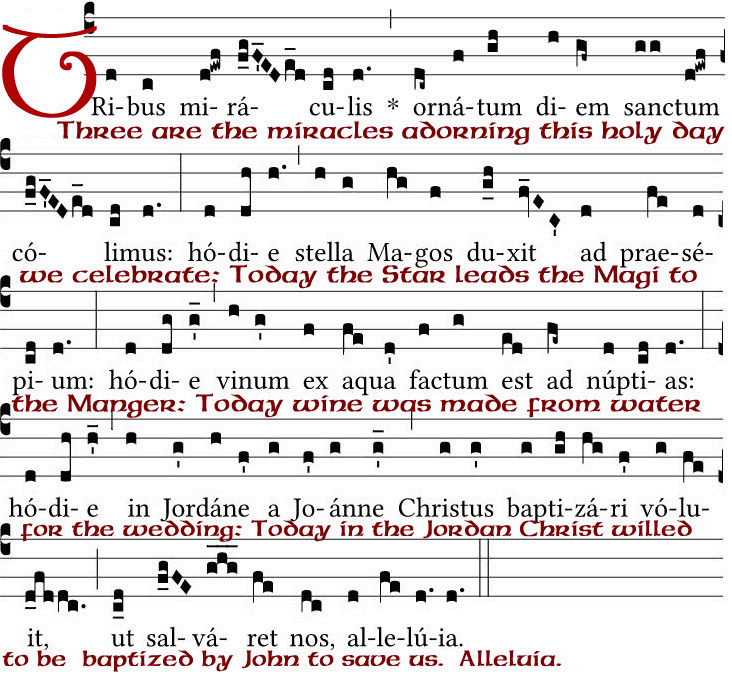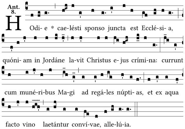 Hodie caelesti sponso juncta est ecclesia quoniam in Jordane lavit Christus ejus crimina currunt cum muneribus magi ad regales nuptias et ex aqua facto vino laetantur convivae alleluia
