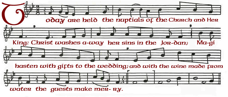 "Today the Church hath been joined to her heavenly Spouse, for Christ hath washed away her sins in the Jordan; the Magi hasten with gifts to the royal nuptials, and the guests are gladdened with wine made from water, alleluia."