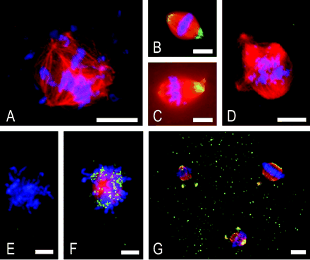Rhesus NTs (6) look superficially normal, yet no pregnancies resulted from 33 embryos transferred into 16 surrogates (compared with seasonably variable 28 to 66% pregnancy rates by assisted reproduction) (7). DNA and microtubule imaging showed disarrayed mitotic spindles with misaligned chromosomes (Fig. 1A; all 116 ECNTs and all 30 SCNTs examined displayed aberrant spindles). Despite these defects, cleavages continue, but unequal chromosome segregations produce aneuploid embryos.