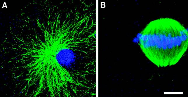 Fig. 1. Chromosomes align on symmetrical mitotic spindles after bovine nuclear transfer, unlike the chaotic spindles detected after primate NT (4). (A) Somatic cell nuclear transfer in cattle oocytes results in a single radially arrayed microtubule aster at first interphase. (B) At first mitosis, bovine NTs organize accurate bipolar mitotic apparatus (green) with aligned chromosomes (blue). Scale bar: A, 10 µm; B, 5 µm.
