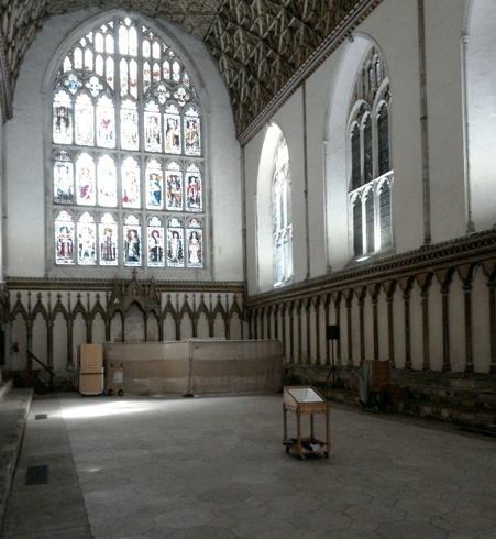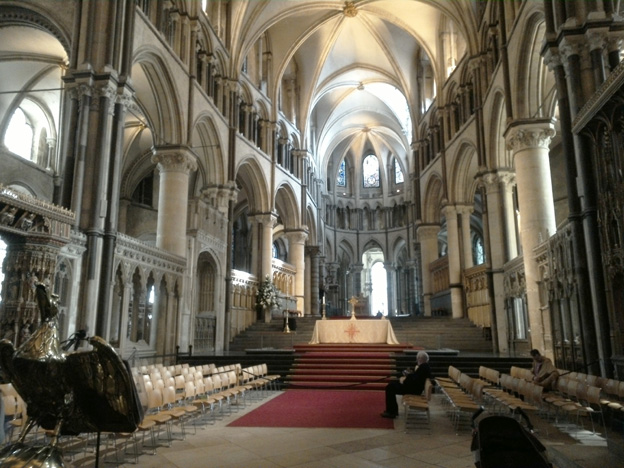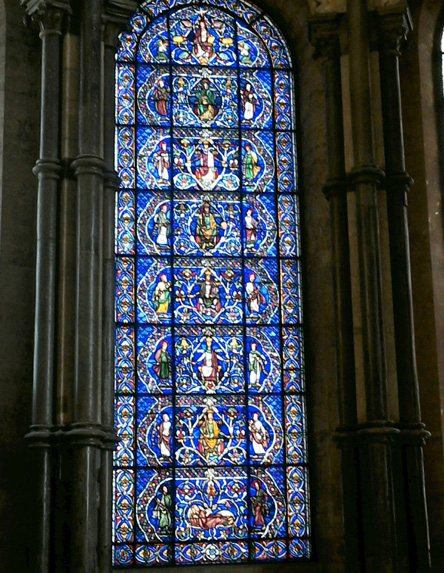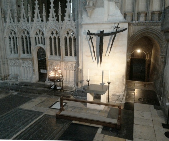 THE assassination of St. Thomas Becket by barons of Henry II in 1170 transformed Canterbury an important site of pilgrimage, commemorated in Chaucer’s Canterbury Tales. The shrine containing St. Thomas’ relics was originally located in the crypt of the cathedral, then later moved (to accomodate the increasing crowds of pilgrims) into a large space behind the choir in the east end with a surrounding ambulatory, permitting pilgrims to circulate freely during liturgies.
