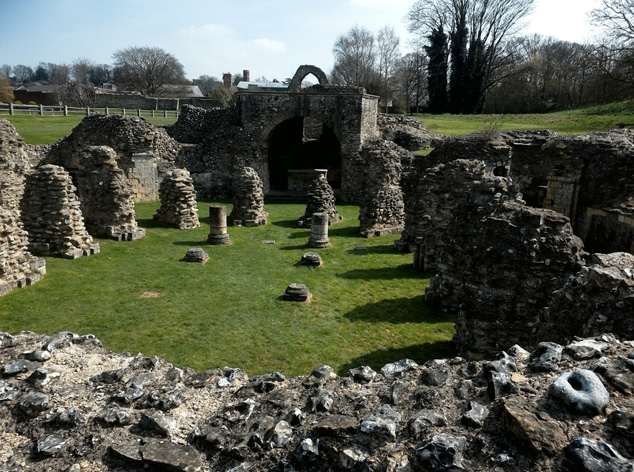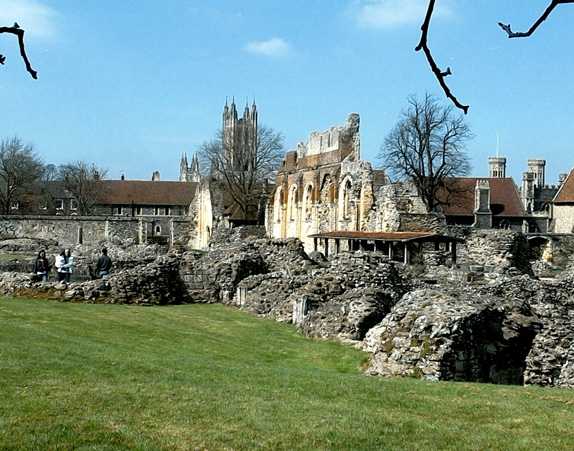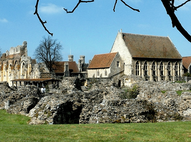 THE RUINS of St. Augustine’s Abbey, the original community founded by St. Augustine of Canterbury in 598, are located about a quarter of a mile east of the cathedral. The community was one of the oldest Benedictine monasteries in England at the time of its suppression by King Henry VIII in 1538. The king transformed part of the abbey into a palace for his fourth queen, Anne of Cleves. Part of the former abbey is now a school; the monastery church and cloister were dismantled and used as a quarry until 1844, when the first efforts were made at restoration and preservation of the site.